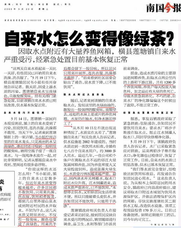 剪报图片:南国今报 自来水怎么变的象绿茶